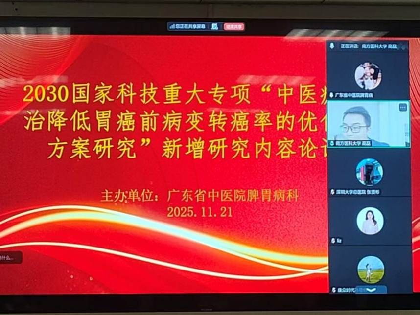 2025年11月21日上午,2030国家科技重大专项“中医瘀毒同治降低胃癌前病变转癌率的优化干预方案研究”优化市场应用研究内容论证会成功举办。本次会议采用线上线下相结合的形式,线下会场设在广东省中医院大学城医院门诊2楼会议室。参会人员包括项目负责人、项目组办公室成员、课题承担单位负责人及成员、论证专家以及拟新增研究内容的实施单位代表。此次论证会的召开,是确保新增方案研究内容科学性、必要性和可行性的关键步骤,为项目高质量推进提供重要支撑。