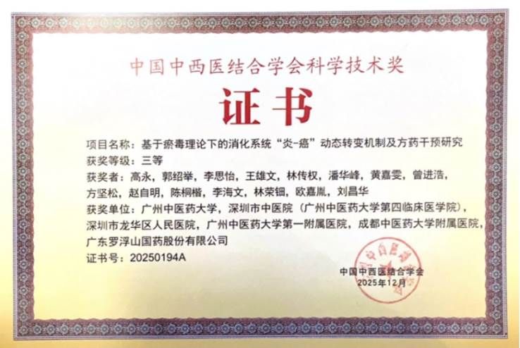 12月20日下午,2025年度“步长杯”中国中西医结合学会科学技术奖颁奖会顺利举行。经过严格评审,国家重点研发专项《中医瘀毒同治降低胃癌前病变转癌率的优化干预方案研究团队》获得科学技术三等奖项,项目由国家自然科学基金青年科学基金(B类)项目获得者——高永研究员牵头,围绕“基于瘀毒理论下的消化系统‘炎-癌’动态转变机制及方药干预研究”联合深圳市中医院(广州中医药大学第四临床医学院)、深圳市龙华区人民医院、广州中医药大学第一附属医院、成都中医药大学附属医院、广东罗浮山国药股份有限公司共同完成的科研项目——荣获三等奖!